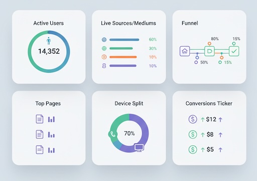 When you launch a campaign, push a promo code, or publish a high-stakes page, you don’t want to wait until tomorrow to learn what happened. Real-time reports show what’s happening on your site right now—who’s arriving, what they’re doing, and whether that activity is turning into meaningful actions. Used well, they help you validate tracking, spot issues early, and prove (or kill) ideas within minutes.